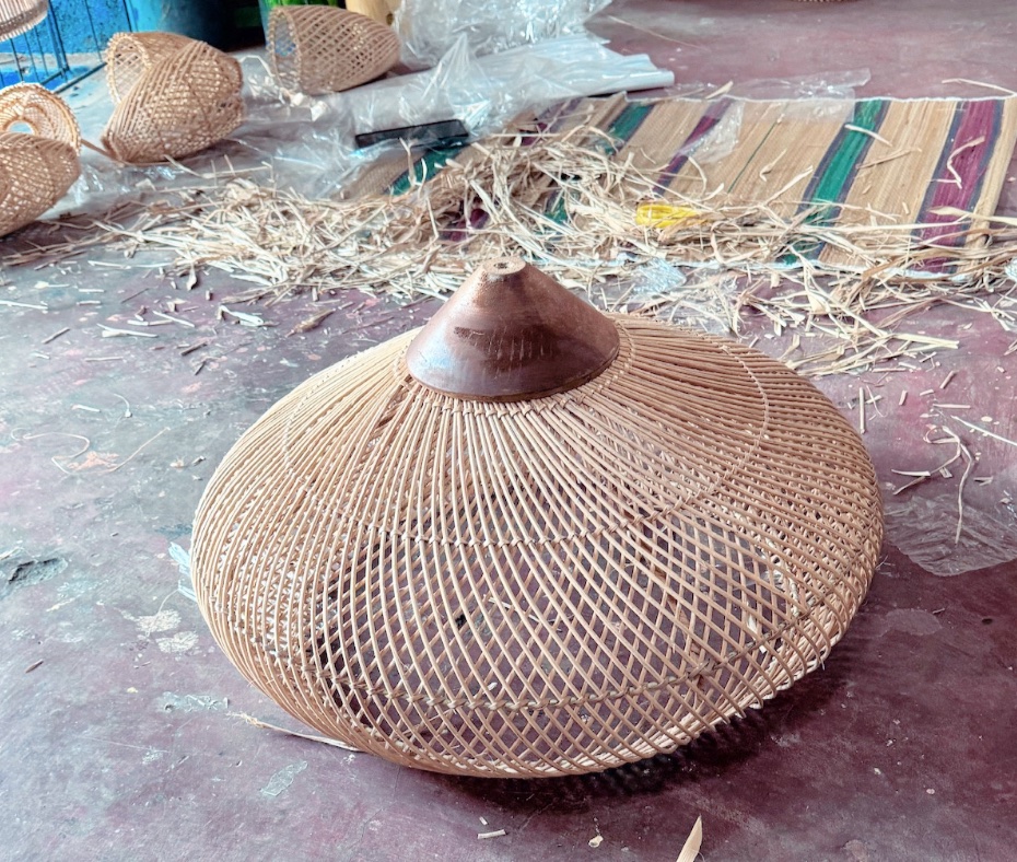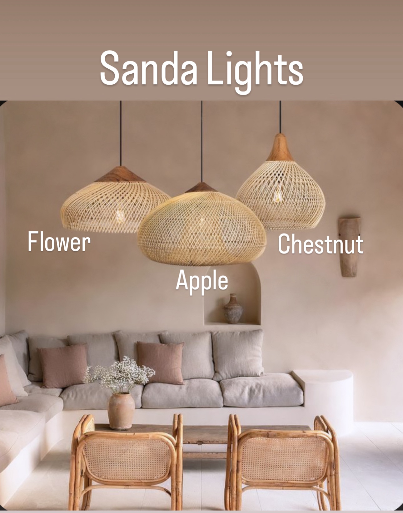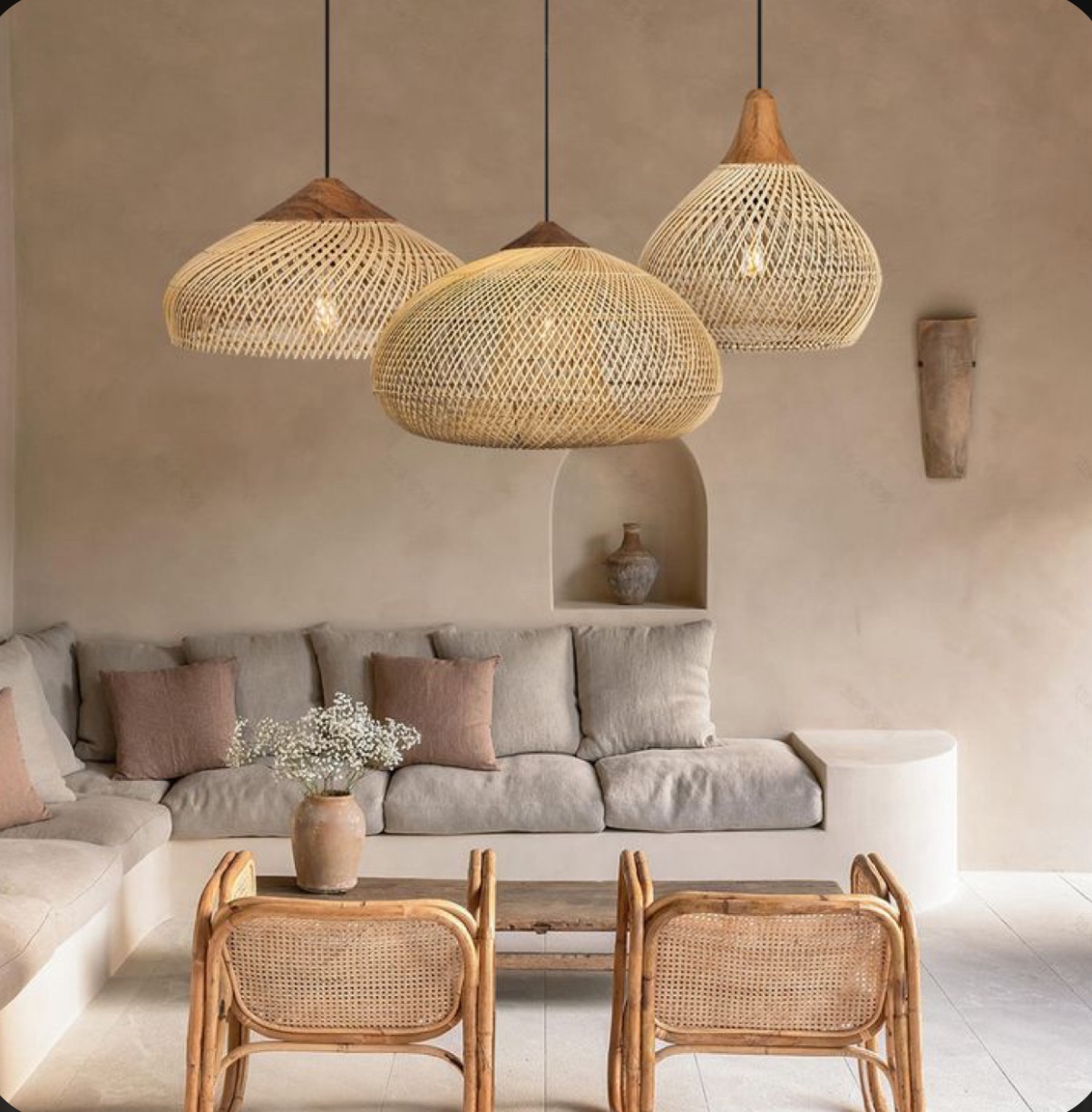 Beautiful rattan and wood chandelier taking a shape of a flower